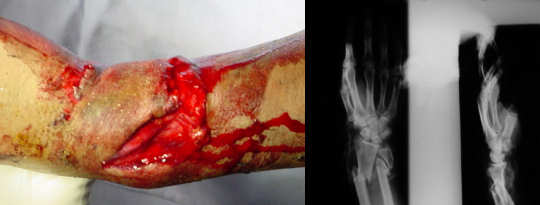 Type III-C open fracture. Wound larger than 10 cm, severe contamination and neurovascular injury.