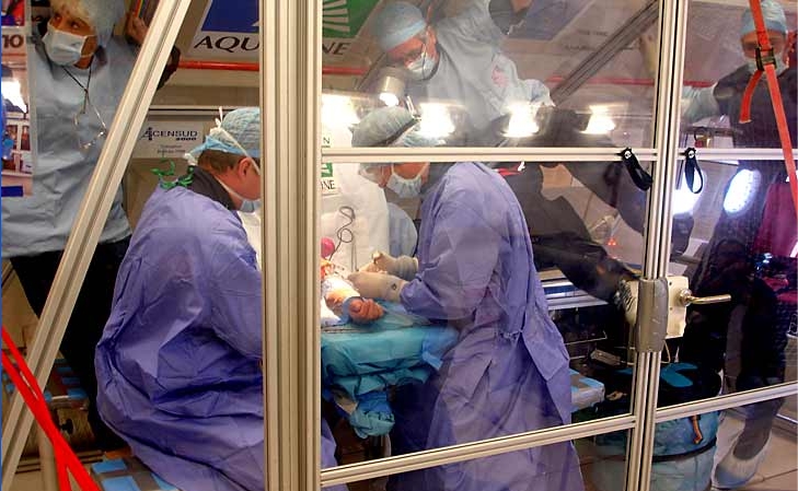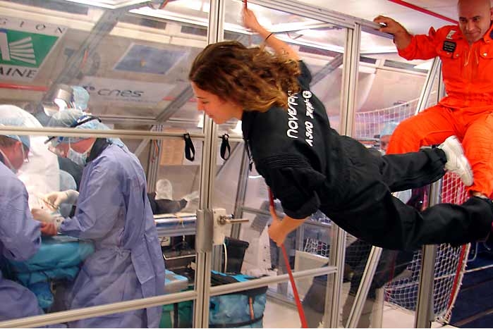A french surgical team leaded by Dominique Martin has performed the first surgery in a zero-gravity flight. The patient a 46 years old male, was a volunteer and he just needed local anesthesia in the forearm.