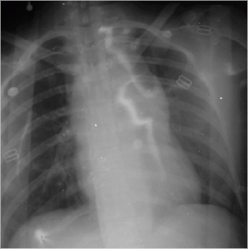 6 Comments Published by JonMikel, M.D. January 23rd, 2006 in Medical ImagesA previously healthy 17 yo woman came in to the ER because she has suffer an automovilistic accident. On the initial evaluation she was with pulse ‘parvus et tardus’ with altered mental status. A chest x-ray was ordered and found an aortic rupture.